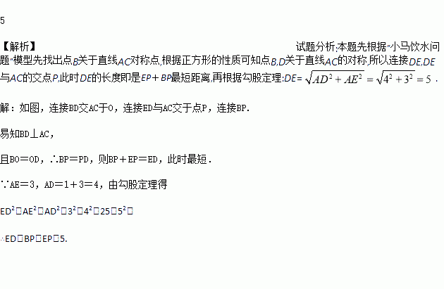 如图,在正方形ABCD中,AB边上有一点E,AE=3,EB=1,在AC上有一点P,使EP+BP最短,求EP+BP的最短长度.