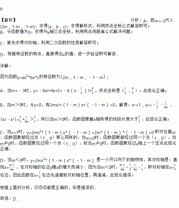 定义[a,b,c]为函数y=ax2+bx+c的特征数,下面给出特征数为[2m,1﹣m,﹣1﹣m]的函数的一些结论,其中不正确的是( )