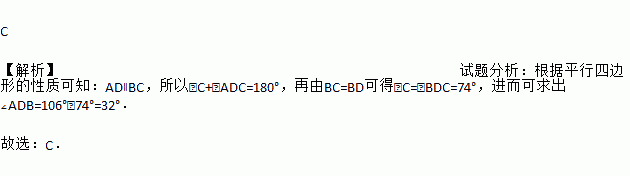 如图,?ABCD中,BC=BD,∠C=74°,则∠ADB的度数是( )