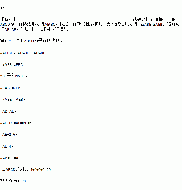 如图,在□ABCD中,BE平分∠ABC,BC=6,DE=2,则□ABCD的周长等于__________.