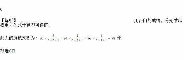 贵阳某广告公司根据实际需要,将专业知识、工作经验、仪表形象三项测试得分按5∶2∶1的比例确定应聘者的测试成绩.若某人专业知识、工作经验、仪表形象的三项得分分别为80分、74分、76分,则此人的测试成绩为( )