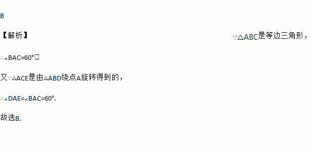 B 【解析】∵△ABC是等边三角形, ∴∠BAC=60°, 又∵△ACE是由△ABD绕点A旋转得到的, ∴∠DAE=∠BAC=60°. 故选B.