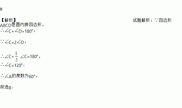 如图,在圆内接四边形ABCD中,∠A、∠C的度数之比为1:2,则∠A的度数为( )