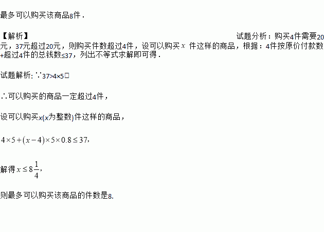 某商店为了对某种商品促销,将定价为5元的商品以下列方式优惠销售:若购买不超过4件,按原价付款;若一次性购买4件以上,超过部分打八折,现有37元钱,最多可以购买该商品多少件?