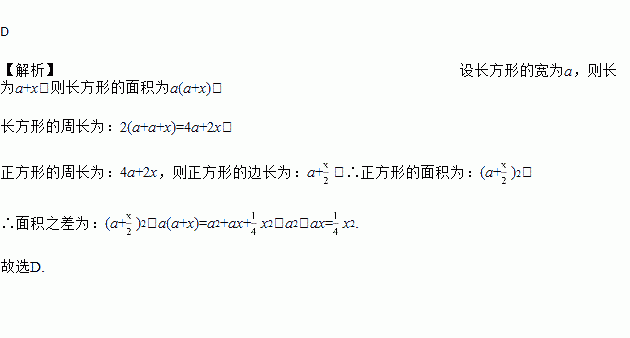 如图,图(1)的正方形的周长与图(2)的长方形的周长相等,且长方形的长比宽多x,则正方形的面积与长方形的面积的差为( )