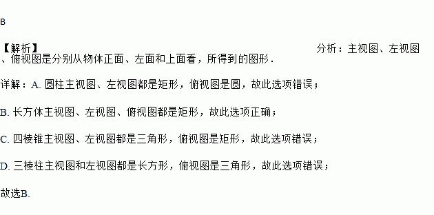 下面四个几何体中,主视图、俯视图和左视图都是矩形的是( )