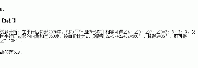 在平行四边形ABCD中,∠A:∠B:∠C=2:3:2,则∠D=( )