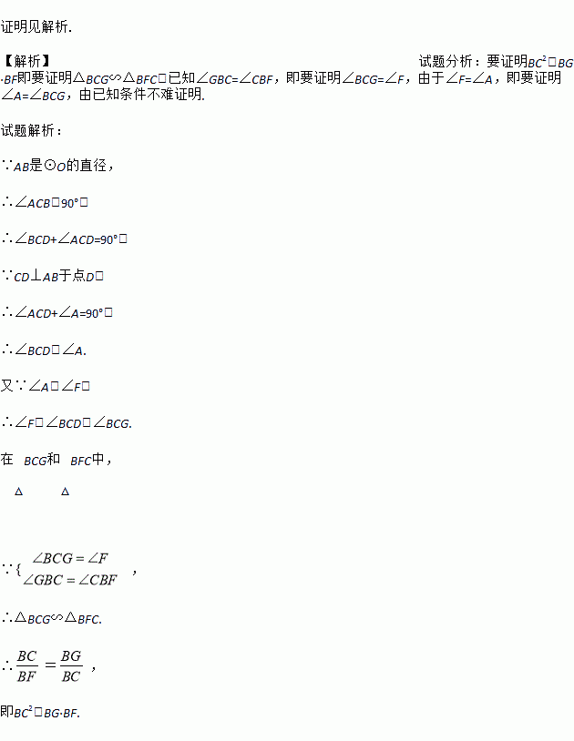 如图,已知AB是⊙O的直径,点C是⊙O上一点,连接BC,AC,过点C作直线CD⊥AB于点D,点E是AB上一点,直线CE交⊙O于点F,连接BF与直线CD延长线交于点G.求证:BC2=BG·BF.