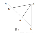 如图4,等腰直角三角形ABC中,∠BAC=90°,AB=AC,点M,N在边BC上,且∠MAN=45°.若BM=1,CN=3,试求出MN的长.