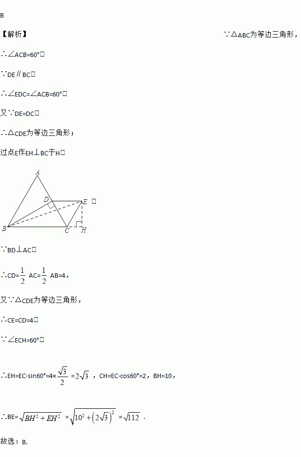 如图,△ABC为等边三角形,过点B作BD⊥AC于点D,过D作DE∥BC,且DE=CD,连接CE、BE,若AB=8,则BE的长为 ( ).