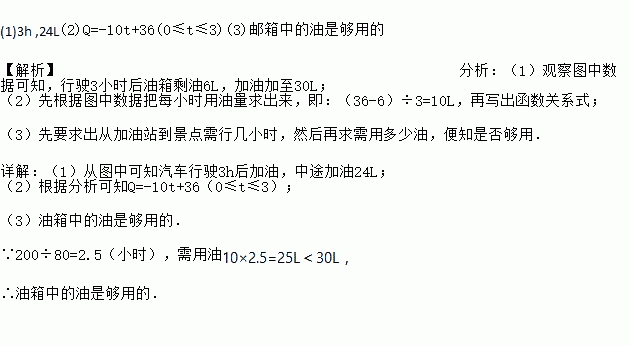 小丽一家利用元旦三天驾车到某景点旅游.小汽车出发前油箱有油36L,行驶ah后,途中在加油站加油若干bL.油箱中余油量Q(L)与行驶时间t(h)之间的关系如图所示.根据图象回答下列问题: