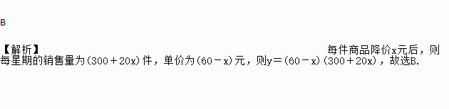 B 【解析】每件商品降价x元后,则每星期的销售量为(300+20x)件,单价为(60-x)元,则y=(60-x)(300+20x),故选B.