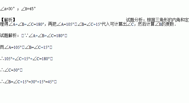 已知:△ABC中, ∠A=1050 , ∠B-∠C=150 ,求∠B、∠C的度数.