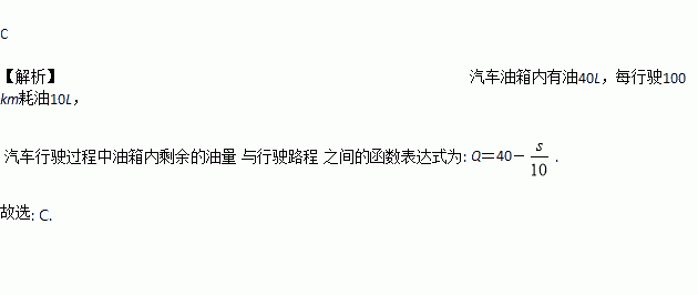 已知汽车油箱内有油40L,每行驶100km耗油10L,则汽车行驶过程中油箱内剩余的油量Q (L)与行驶路程s(km)之间的函数表达式是 ( )