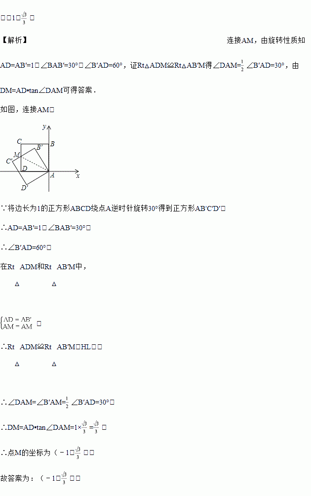 如图,正方形ABCD的边长为1,点A与原点重合,点B在y轴的正半轴上,点D在x轴的负半轴上,将正方形ABCD绕点A逆时针旋转30°至正方形AB'C′D′的位置,B'C′与CD相交于点M,则点M的坐标为_____.