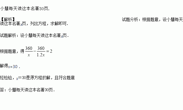 七年(三)班开展“诵读经典,光亮人生”读书活动.小智和小慧同学读了同一本360页的名著.根据下面两个人的对话,求小慧每天读这本名著的页数.