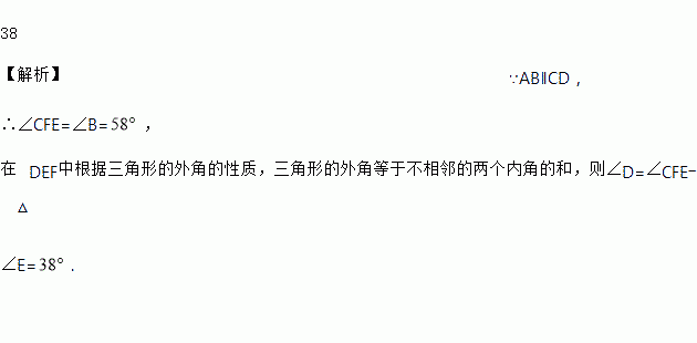 如图,AB∥CD,∠B=58°,∠E=20°,则∠D的度数为______度.