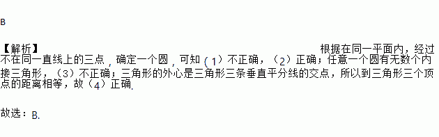 B ¡¾½âÎö¡¿¸ù¾ÝÔÚÍ¬Ò»Æ½ÃæÄÚ£¬¾¹ý²»ÔÚͬһֱÏßÉϵÄÈýµã£¬È·¶¨Ò»¸öÔ²£¬¿ÉÖª£¨1£©²»ÕýÈ·£¬£¨2£©ÕýÈ·£»ÈÎÒâÒ»¸öÔ²ÓÐÎÞÊý¸öÄÚ½ÓÈý½ÇÐΣ¬£¨3£©²»ÕýÈ·£»Èý½ÇÐεÄÍâÐÄÊÇÈý½ÇÐÎÈýÌõ´¹Ö±Æ½·ÖÏߵĽ»µã£¬ËùÒÔµ½Èý½ÇÐÎÈý¸ö¶¥µãµÄ¾àÀëÏàµÈ£¬¹Ê£¨4£©ÕýÈ·. ¹ÊÑ¡£ºB.