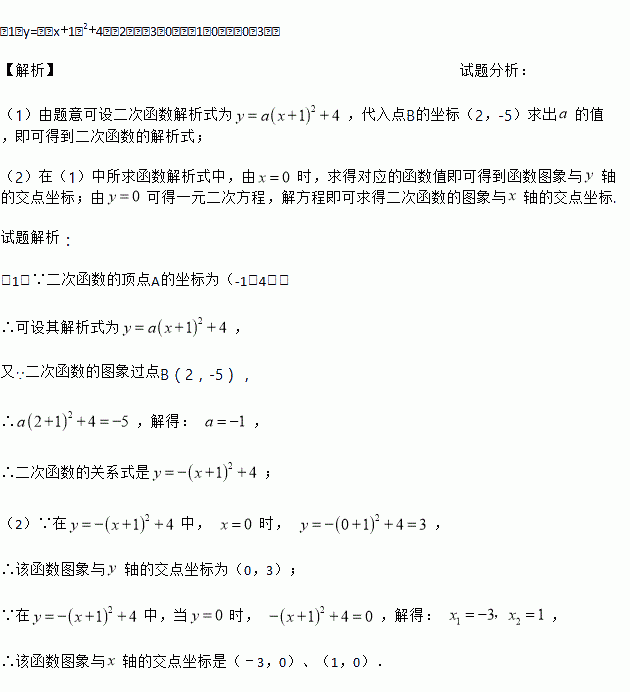 (1)y=﹣(x+1)2+4;(2)(﹣3,0),(1,0),(0,3). 【解析】试题分析: (1)由题意可设二次函数解析式为,代入点B的坐标(2,-5)求出的值,即可得到二次函数的解析式; (2)在(1)中所求函数解析式中,由时,求得对应的函数值即可得到函数图象与轴的交点坐标;由可得一元二次方程,解方程即可求得二次函数的图象与轴的交点坐标. 试题解析: (1)∵二...