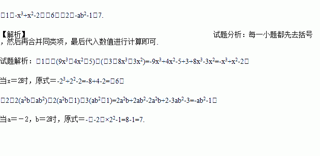 (1)-(9x3-4x2+5)-(-3-8x3+3x2),其中x=2;