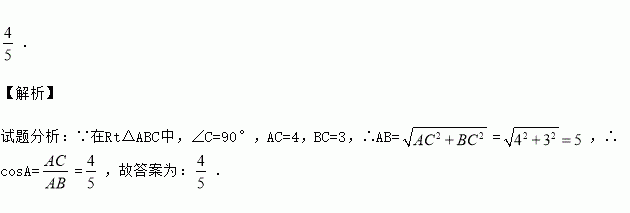 在Rt△ABC中,∠C=90°,BC=3,AC=4,那么cos A的值等于 .
