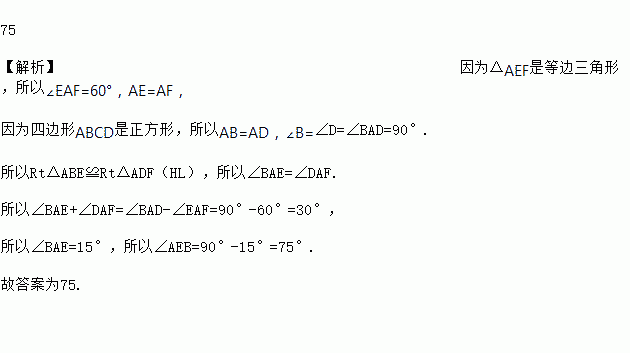如图,在正方形ABCD中,等边三角形AEF的顶点E、F分别在边BC和CD上,则∠AEB________度.