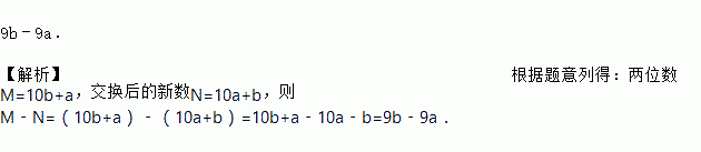 9b﹣9a. 【解析】根据题意列得:两位数M=10b+a,交换后的新数N=10a+b,则M﹣N=(10b+a)﹣(10a+b)=10b+a﹣10a﹣b=9b﹣9a.
