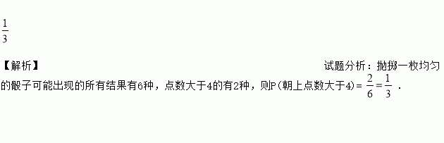 任意抛掷一枚均匀的骰子一次,朝上的点数大于4的概率等于________.