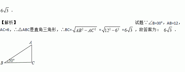 在△ABC中,∠B=30°,AB=12,AC=6,则BC= .