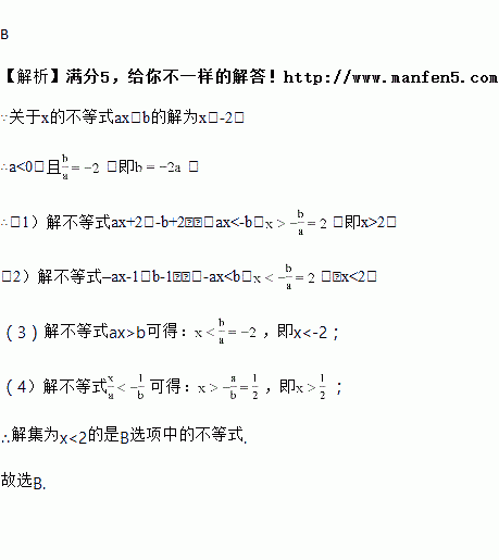 已知关于x的不等式ax<b的解为x>-2,则下列关于x的不等式中,解为x<2的是( )