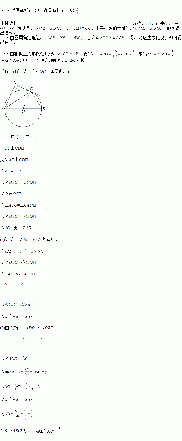 如图,点C在以AB为直径的⊙O上,AD与过点C的切线垂直,垂足为点D.