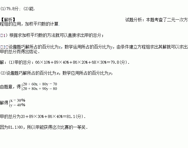 (2)±¾´Î´óÈü×éί»á×îºó¾ö¶¨£¬×Ü·ÖÔÚ80·ÖÒÔÉÏ(°üÀ¨80·Ö)µÄѧÉú»ñÒ»µÈ½±£®ÏÖ»ñϤÒÒ¡¢±ûµÄ×Ü·Ö·Ö±ðÊÇ70·Ö¡¢80·Ö£¬¼×µÄÆßÇÉ°åÆ´Í¼¡¢Ä§·½¸´ÔÁ½ÏîµÄµÃ·ÖÕÛËãºóµÄ·ÖÊýºÍÊÇ20·Ö£¬¼×ÄÜ·ñ»ñµÃÕâ´Î±ÈÈüµÄÒ»µÈ½±£¿