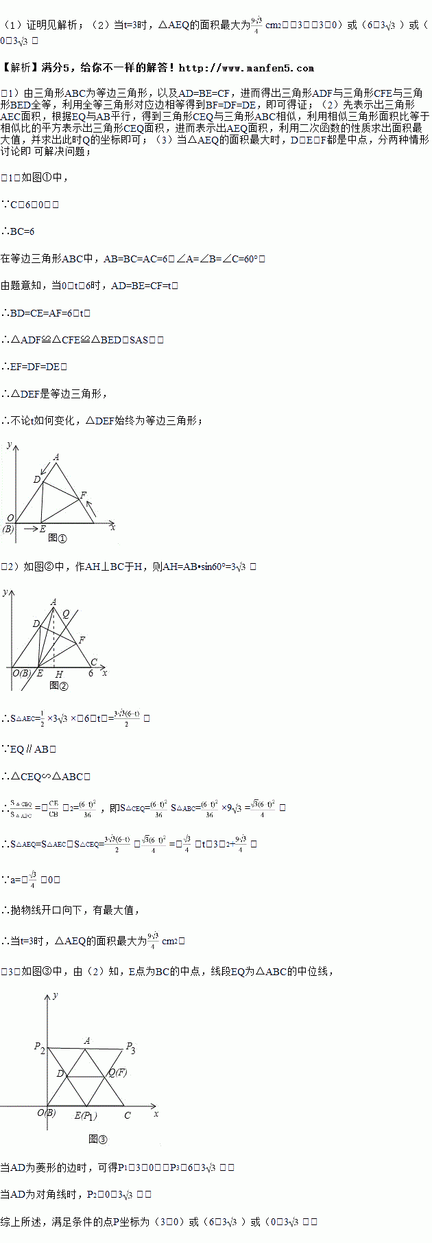 如图,在平面直角坐标系中,等边三角形ABC的顶点B与原点O重合,点C在x轴上,点C坐标为(6,0),等边三角形ABC的三边上有三个动点D、E、F(不考虑与A、B、C重合),点D从A向B运动,点E从B向C运动,点F从C向A运动,三点同时运动,到终点结束,且速度均为1cm/s,设运动的时间为ts,解答下列问题: