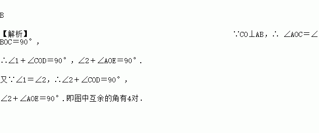 B 【解析】∵CO⊥AB,∴ ∠AOC=∠BOC=90°, ∴∠1+∠COD=90°,∠2+∠AOE=90°. 又∵∠1=∠2,∴∠2+∠COD=90°, ∠2+∠AOE=90°.即图中互余的角有4对.