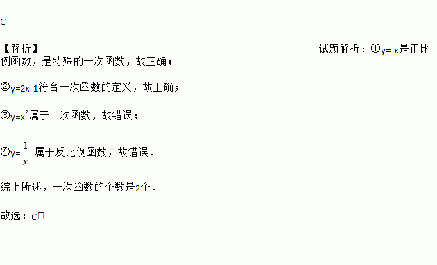 C 【解析】试题解析:①y=-x是正比例函数,是特殊的一次函数,故正确; ②y=2x-1符合一次函数的定义,故正确; ③y=x2属于二次函数,故错误; ④y=属于反比例函数,故错误. 综上所述,一次函数的个数是2个. 故选:C.