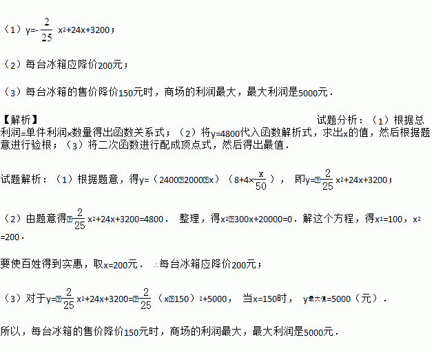 (2)商场要想在这种冰箱销售中每天盈利4800元,同时又要使百姓得到实惠,每台冰箱应降价多少元?