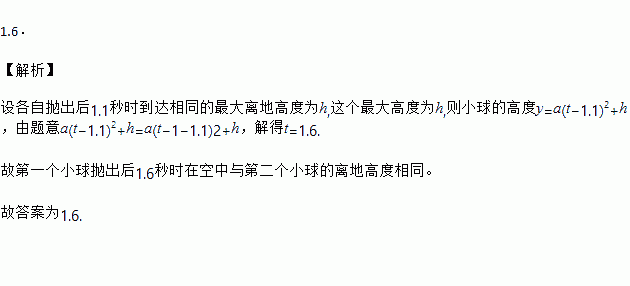 竖直上抛的小球离地高度是它运动时间的二次函数,小军相隔1秒依次竖直向上抛出两个小球,假设两个小球离手时离地高度相同,在各自抛出后1.1秒时到达相同的最大离地高度,第一个小球抛出后t秒时在空中与第二个小球的离地高度相同,则t= .