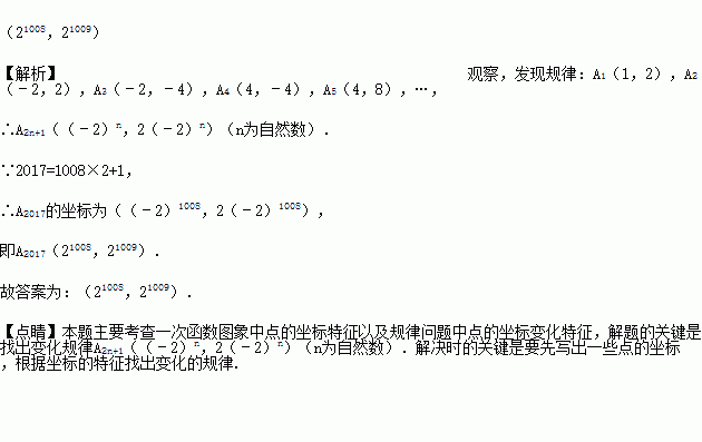 如图,在平面直角坐标系中,函数y=2x和y=﹣x的图象分别为直线l1,l2,过点(1,0)作x轴的垂线交l1于点A1,过点A1作y轴的垂线交l2于点A2,过点A2作x轴的垂线交l2于点A3,过点A3作y轴的垂线交l2于点A4,…依次进行下去,则点A2017的坐标为____.