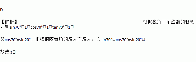 C. sin70°<cos70°<tan70° D. cos70°<sin70°<tan70°