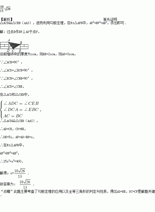 课间,小聪拿着老师的等腰直角三角板玩,不小心掉到两墙之间(如图),∠ACB=90°,AC=BC,从三角板的刻度可知AB=20 cm,小聪很快就知道了砌墙砖块的厚度(每块砖的厚度相等)为______ cm.