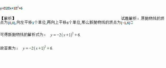 y=﹣2(x+1)2+6 【解析】试题解析:原抛物线的顶点为(0,0),向左平移1个单位,再向上平移6个单位,那么新抛物线的顶点为(?1,6), 可得新抛物线的解析式为: 故答案为: