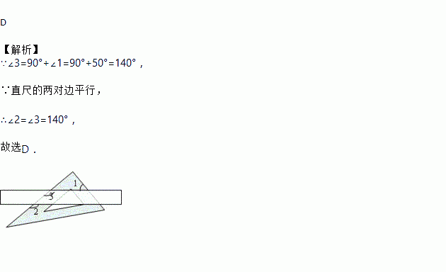D 【解析】∵∠3=90°+∠1=90°+50°=140°, ∵直尺的两对边平行, ∴∠2=∠3=140°, 故选D.