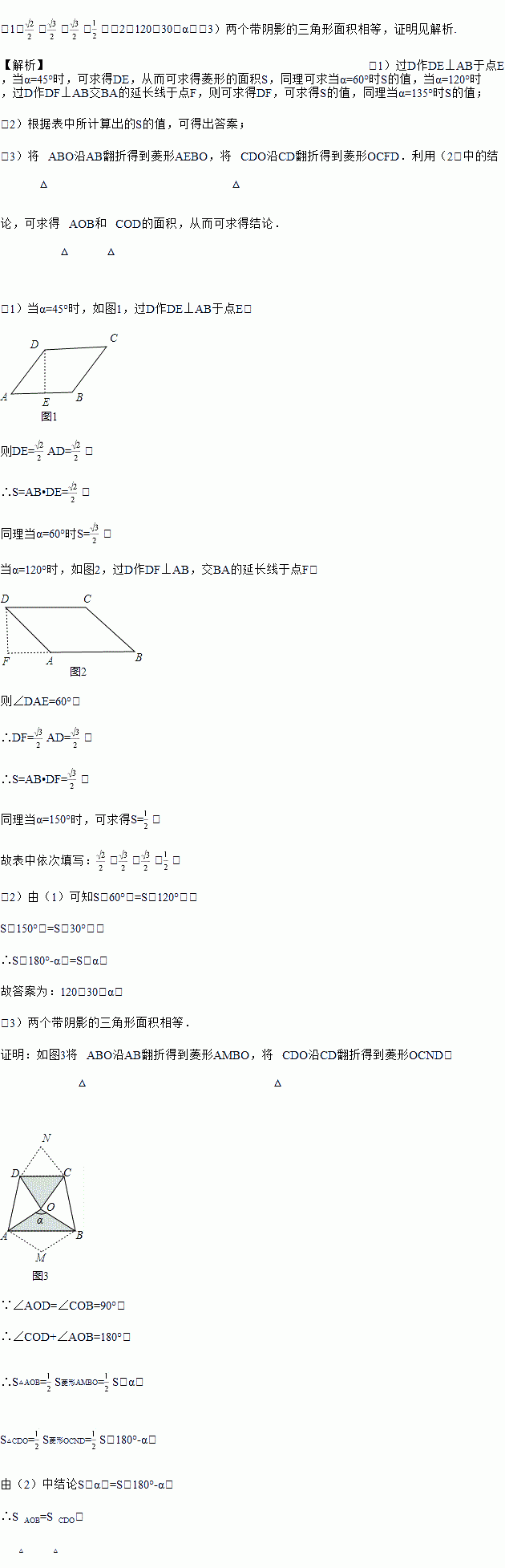 ,∠AOB=α,试探究图中两个带阴影的三角形面积是否相等,并说明理由(注:可以利用(2)中的结论).