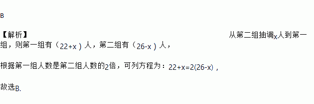 某班分两组去两处植树,第一组22人,第二组26人,现在第一组植树遇到困难,需第二组支援,问从第二组调多少人去第一组才能使第一组人数是第二组的2倍,设抽调