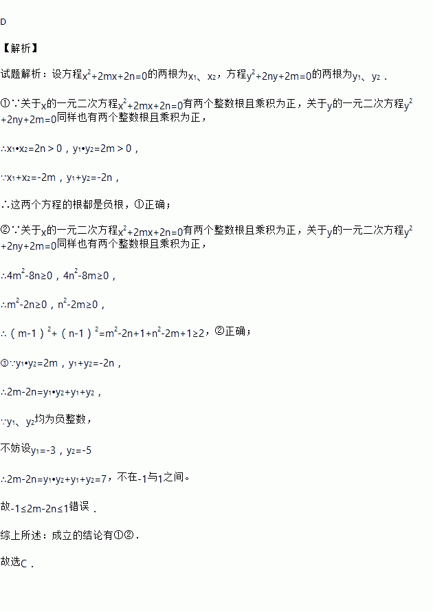 关于x的一元二次方程x2+2mx+2n=0有两个整数根且乘积为正,关于y的一元二次方程y2+2ny+2m=0同样也有两个整数根且乘积为正,给出三个结论:①这两个方程的根都为负根;②(m-1)2+(n-1)2≥2;③-1≤2m-2n≤1.其中正确结论的个数是( )