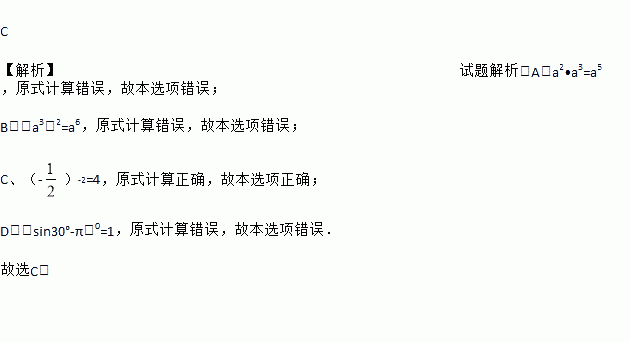 A. a2•a3=a6 B. (a3)2=a9 C. (﹣)﹣2=4 D. (sin30°﹣π)0=0