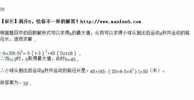 从地面竖直向上抛出一小球,小球离地面的高度h(米)与小球运动时间t(秒)之间关系是h=30t﹣5t2(0≤t≤6),则小球从抛出后运动4秒共运动的路径长是_____米.