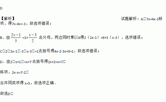 D 【解析】试题解析:A、7x=4x-3移项,得7x-4x=-3,故选项错误; B、由=1+去分母,两边同时乘以6得2(2x-1)=6+3(x-3),选项错误; C、2(2x-1)-3(x-3)=1去括号得4x-2-3x+9=1,故选项错误; D、由2(x+1)=x+7去括号得2x+2=x+7, 移项,2x-x=7-2, 合并同类项得x=5,故选项正确. ...