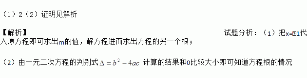 (1)2(2)证明见解析 【解析】试题分析:(1)把x=﹣1代入原方程即可求出m的值,解方程进而求出方程的另一个根; (2)由一元二次方程的判别式计算的结果和0比较大小即可知道方程根的情况