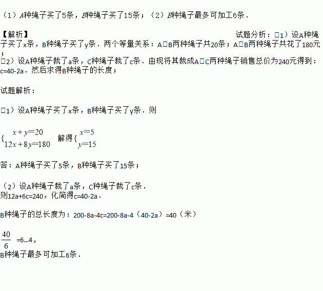 (1)已知购买A,B两种绳子共20条花了180元,问A,B两种绳子各购买了多少条?
